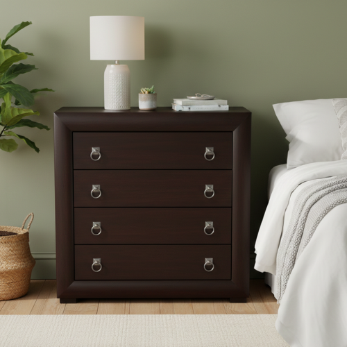 The Panama Chest of Drawers combines timeless elegance with practical storage. Featuring a sturdy construction with a rich mahogany veneer and a semi-gloss finish, this chest brings warmth and sophistication to any room. Its bent wood edging adds a touch of craftsmanship, making it a stylish and functional centerpiece. With four spacious drawers, the Panama Chest offers ample storage for clothing, linens, or essentials while maintaining a classic design that complements a variety of interior styles.