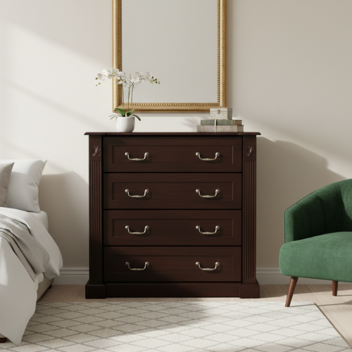 The Persia Mahogany Chest of Drawers combines timeless craftsmanship with sophisticated detailing to enhance any interior. Crafted from premium mahogany wood, this chest features a semi-gloss finish that highlights its rich grain and warm tones. The unique addition of a brown leather inlay on the top adds a touch of elegance and luxury. Designed with four spacious drawers, it provides ample storage for clothing, linens, or other essentials while maintaining a compact and functional size. Its classic style ensures it complements both traditional and modern décors.