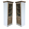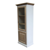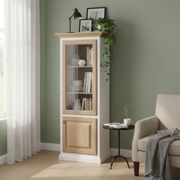 The Country Oak and White Bookshelf offers a stylish mix of open display and closed storage with a glass-and-wood door design, perfect for organizing and showcasing items.