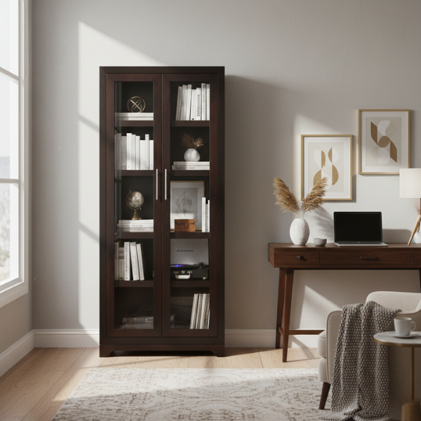 The Lampung Mahogany Bookshelf combines timeless elegance with smart storage, featuring glass doors above and solid doors below for a refined blend of display and concealment.