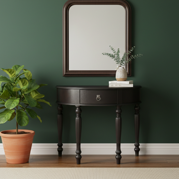 - Characteristics: Showcases classic turned legs a small drawer and half moon shape.