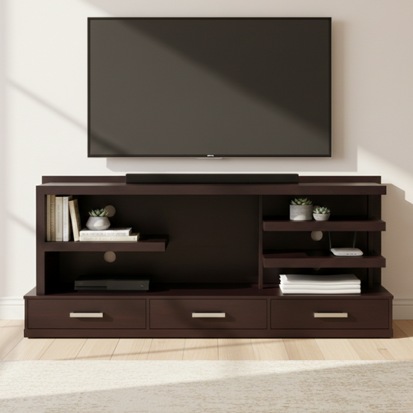 The Belle Mahogany TV Stand  is a stylish and functional addition to any modern living space. Crafted from premium mahogany wood and veneer, this TV stand boasts a warm, natural finish that varies slightly from piece to piece, highlighting the unique character of the wood. The semi-gloss finish enhances its elegance while ensuring easy maintenance.