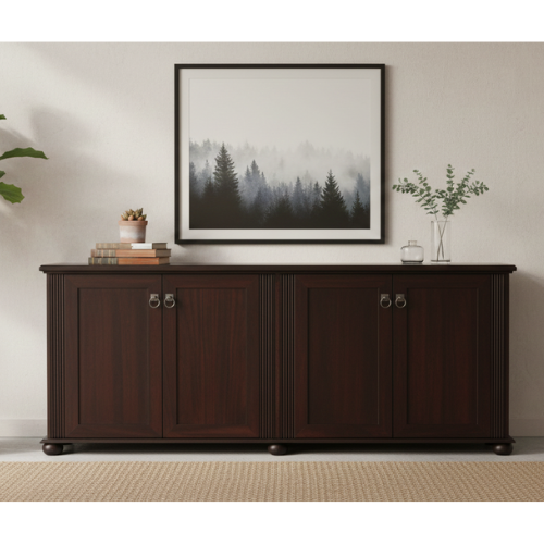 The Valentino Mahogany Credenza, a stylish and functional storage solution. Crafted from premium Mahogany wood, this credenza offers durability and a sophisticated finish. Featuring four spacious doors and an internal shelf designed to accommodate box files, this piece provides ample storage while keeping your workspace organized. Its sleek design effortlessly blends into any modern décor.